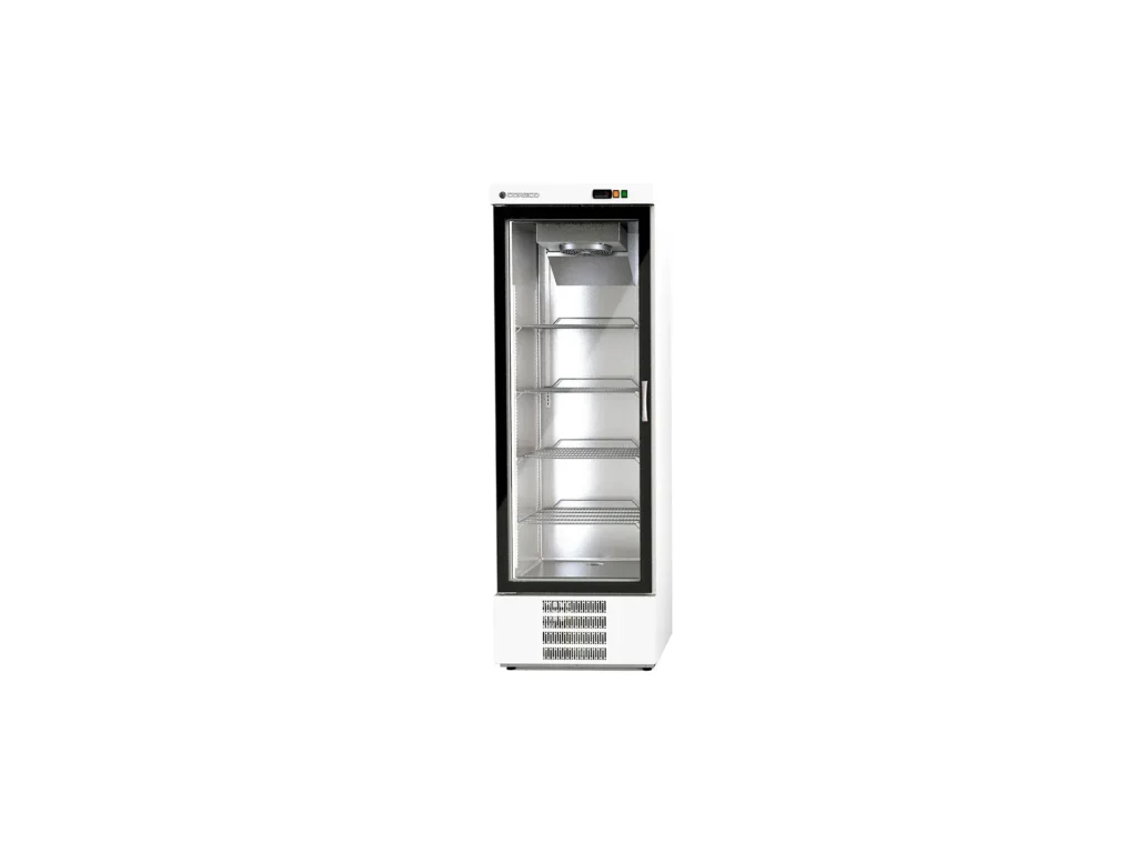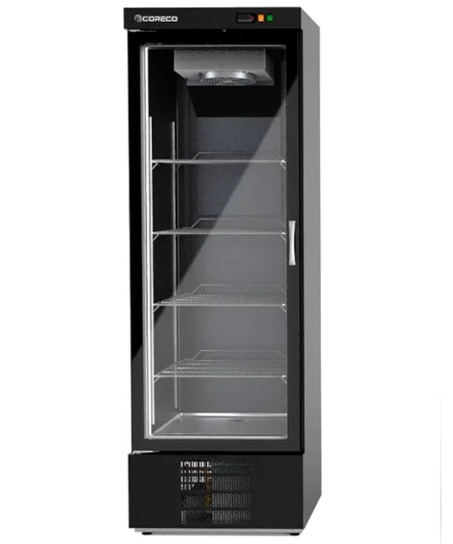 The entire range of CORECO display cabinets is manufactured in a 70 mm insulated monobloc, compact, with no internal joints of removable parts or recessed door frames. Reinforced hinges and handles, metal shelves, back or top-mounted air curtain flow evaporators for the most demanding cooling needs.