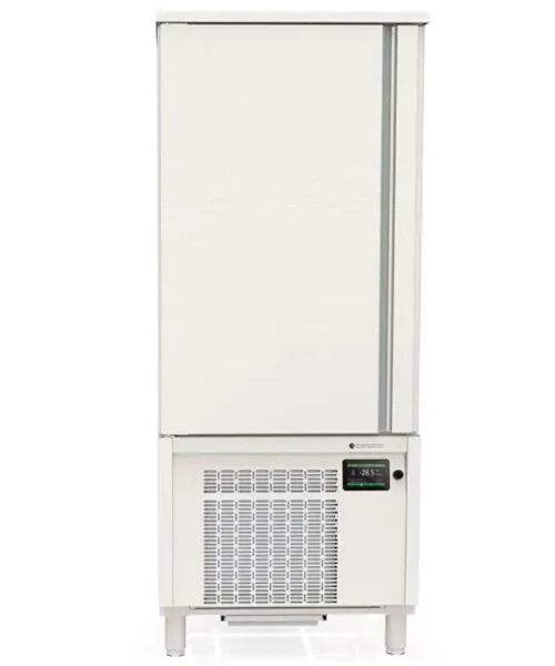 Un refroidisseur à air est un appareil qui abaisse rapidement la température des aliments. Les refroidisseurs à air sont également connus sous le nom de congélateurs à air comprimé ou de congélateurs à air pulsé. Ils sont généralement dotés de plusieurs étagères où des plateaux d'aliments ou des plateaux de feuilles peuvent être stockés et refroidis à des températures extrêmement basses.