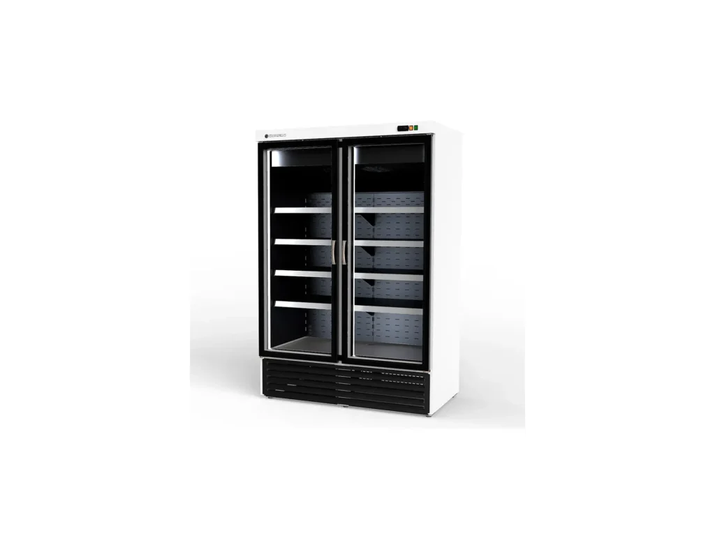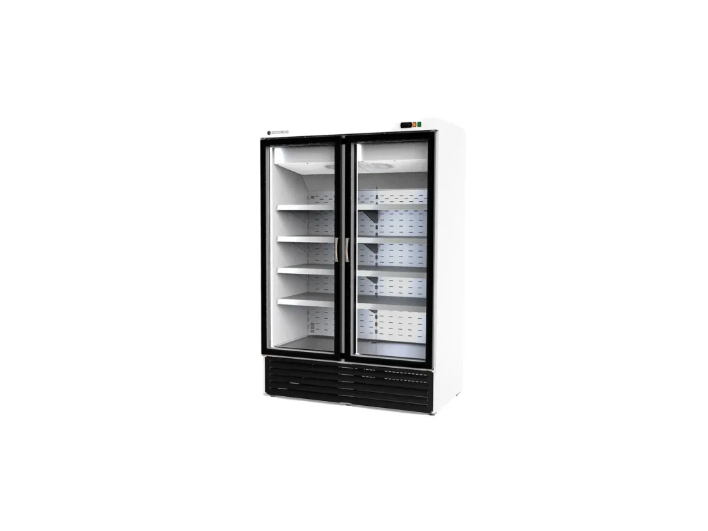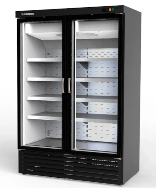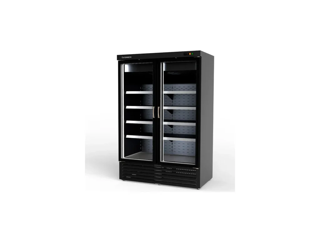 Toda la gama de armarios expositores CORECO, se fabrica en un monobloque con aislamiento de 70 mm, compacto, sin uniones internas de piezas desmontables o marcos de puerta encastrables. Bisagras y tiradores reforzados, estantes metálicos, evaporadores por flujo de cortina de aire al respaldo o montados en la parte superior para las necesidades de enfriamiento más exigentes.